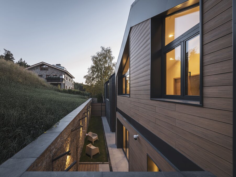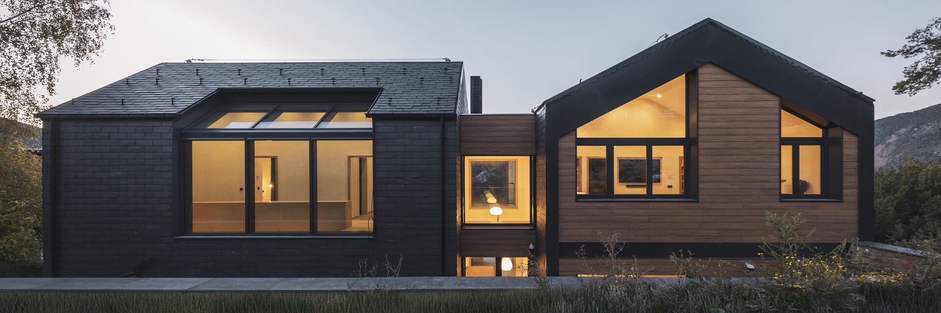 La vivienda se caracteriza por una volumetría que responde al paisaje de montaña, con dos cuerpos principales rematados por cubiertas inclinadas a dos aguas. El revestimiento de pizarra se despliega desde las cubiertas hasta las fachadas, creando una continuidad visual que se enriquece con la incorporación de piedra natural y madera, materiales que dialogan con la tradición arquitectónica andorrana.